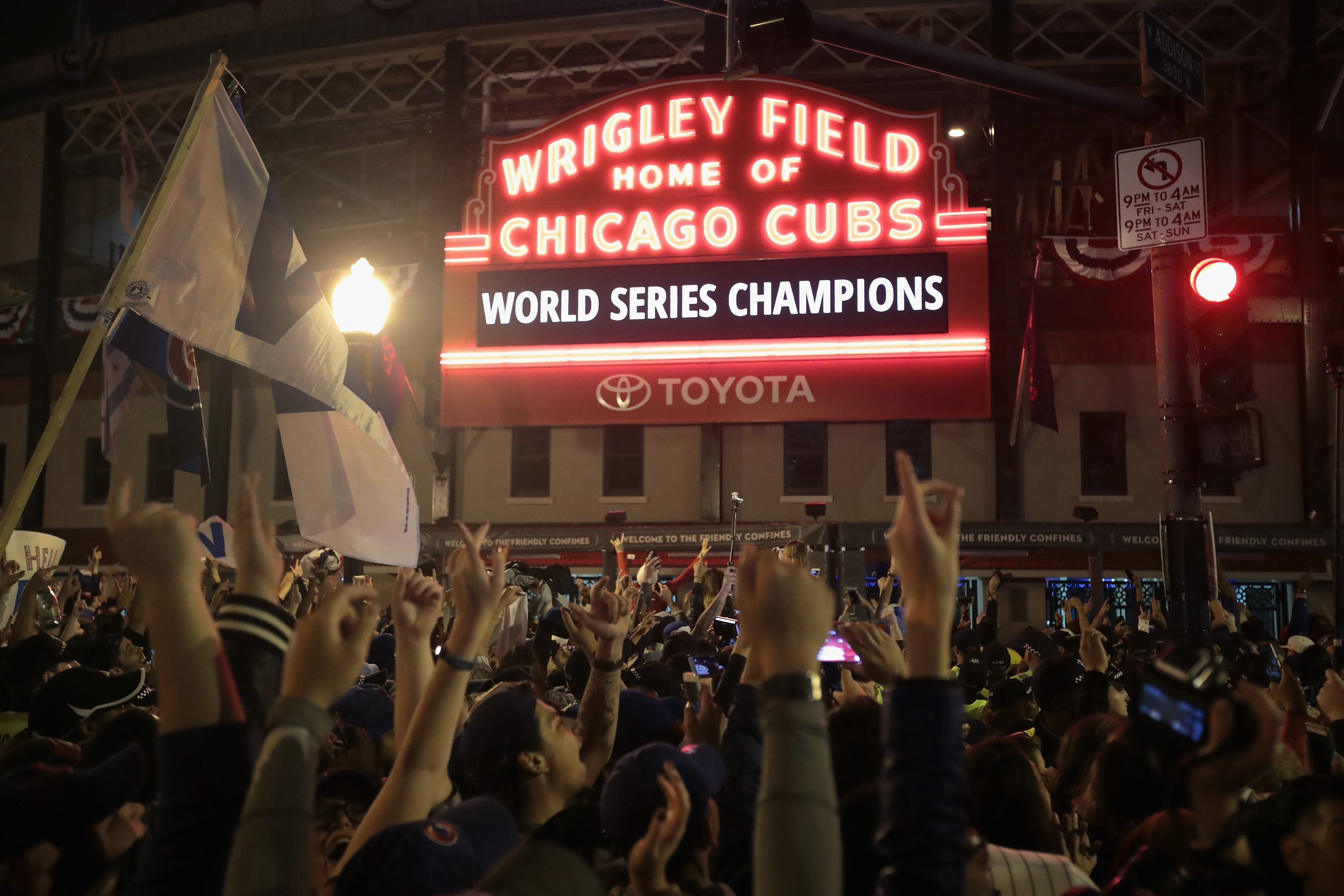 As the planning for an official celebration begins—complete with a parade, cleaning crews have their work cut out for them outside Wrigley Field following the Cubs dramatic World Series victory. Fans filled the streets watching the game on giant screens outside the stadium as the Cubs took care of business in Cleveland. Some posts on Twitter are saying a number of cars were smashed in Wrigleyville—the sports-bar filled neighborhood of the legendary stadium. Bottles were thrown and multiple people took down an electric pole and carried it down a street. EMS was called out to the area for a person who fell after climbing up a pole.